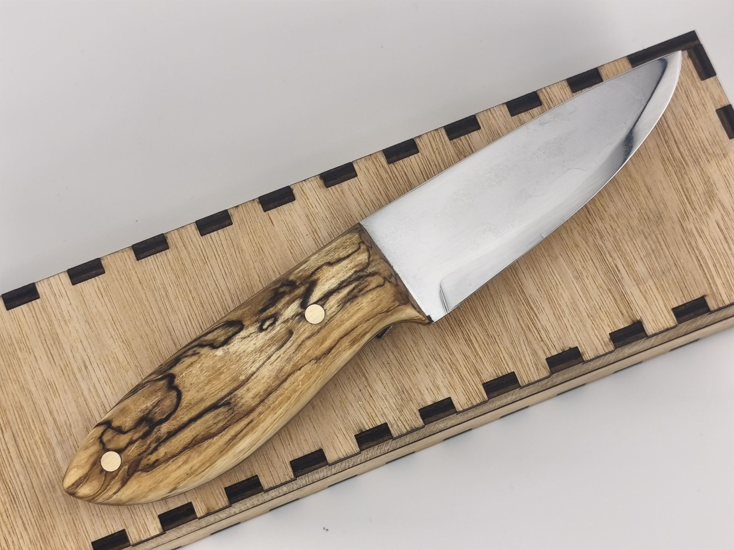 La forme est d’inspiration scandinave mais en acier 135Cr6 avec une trempe sélective faite à l’argile (méthodes traditionnelles Japonaise)
