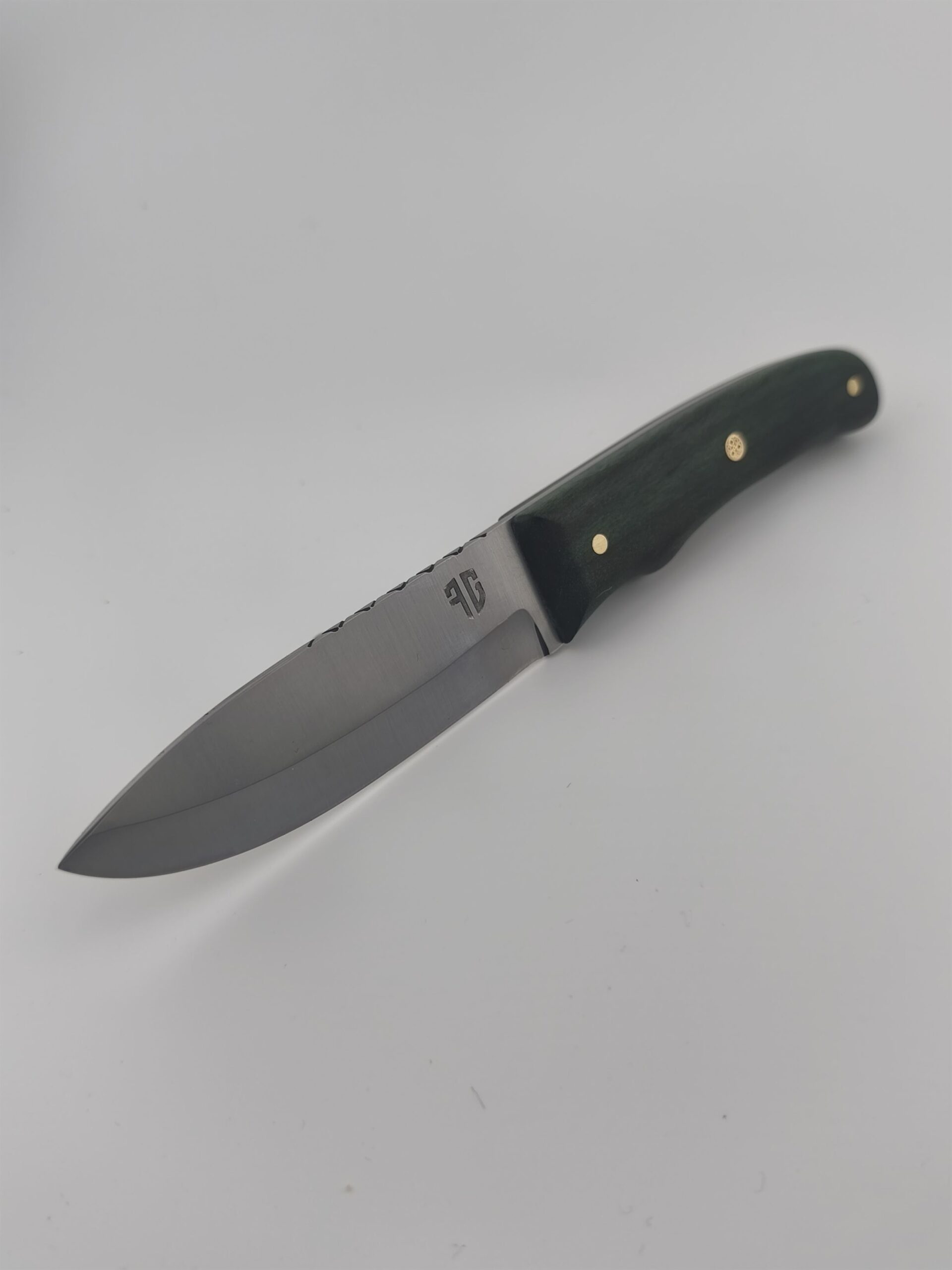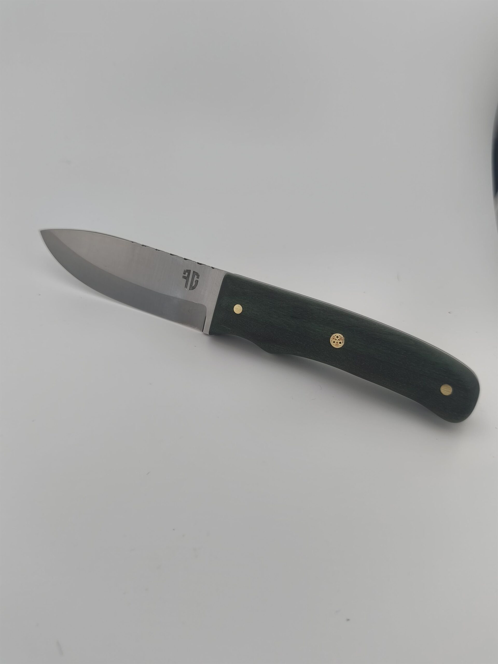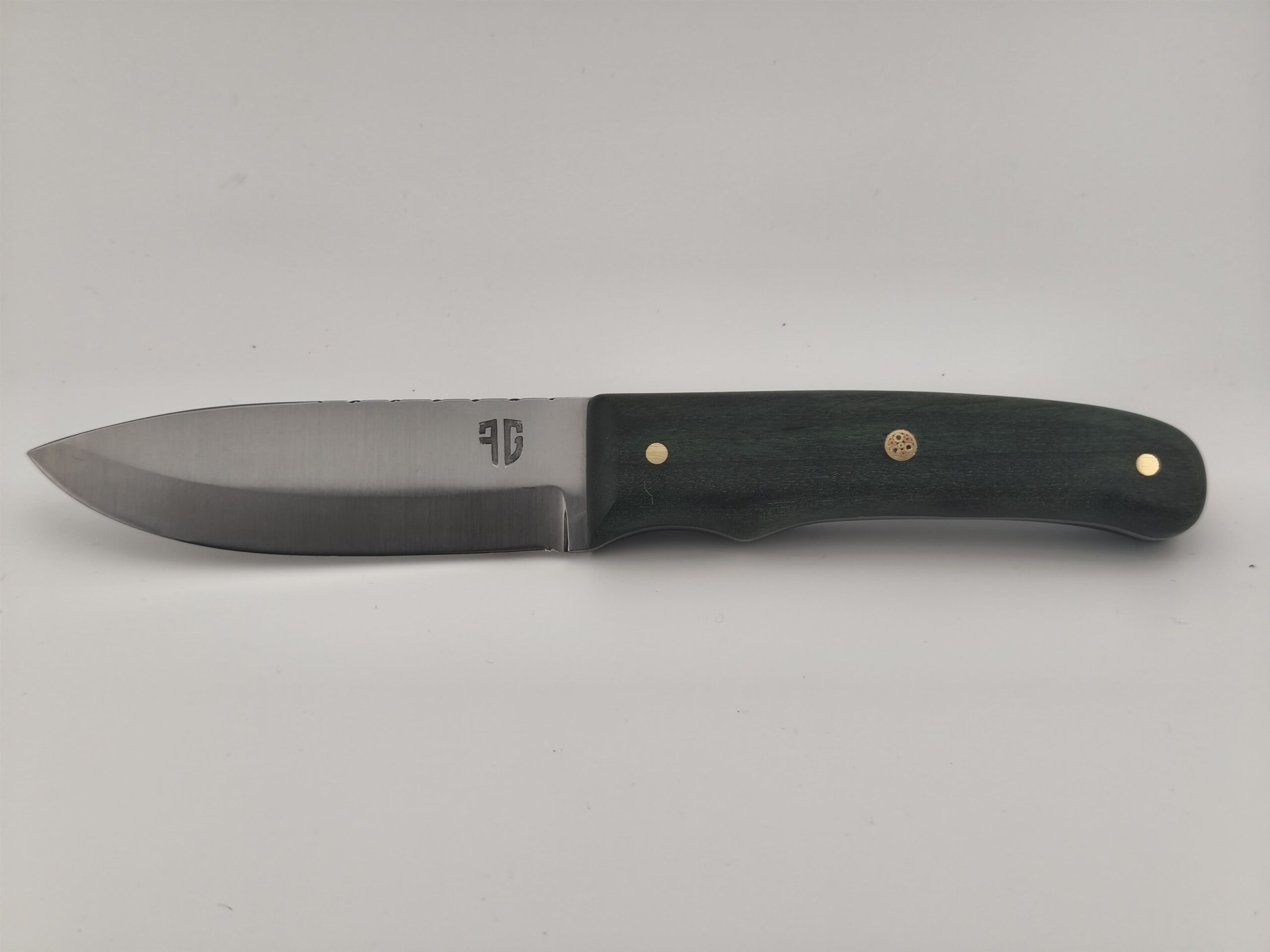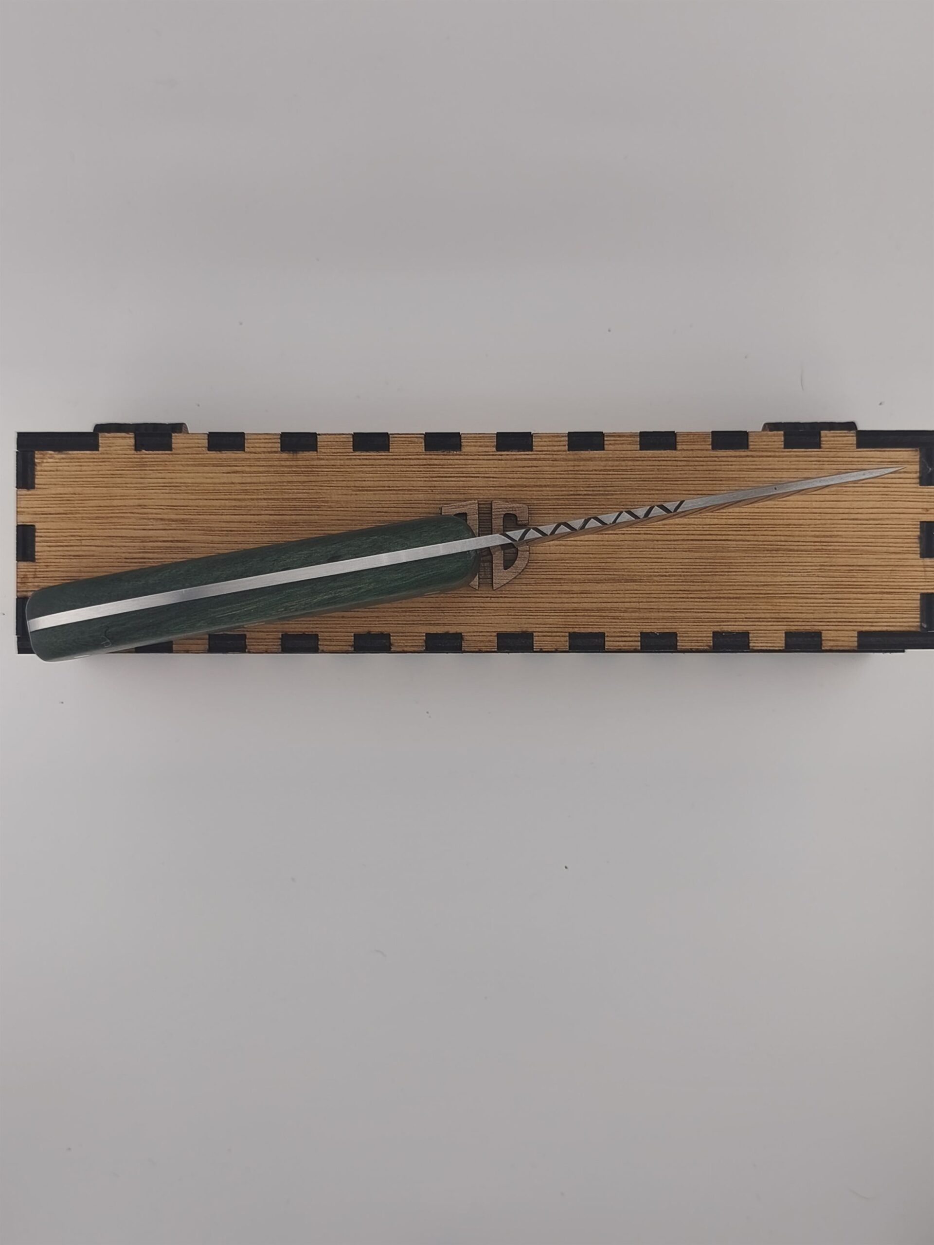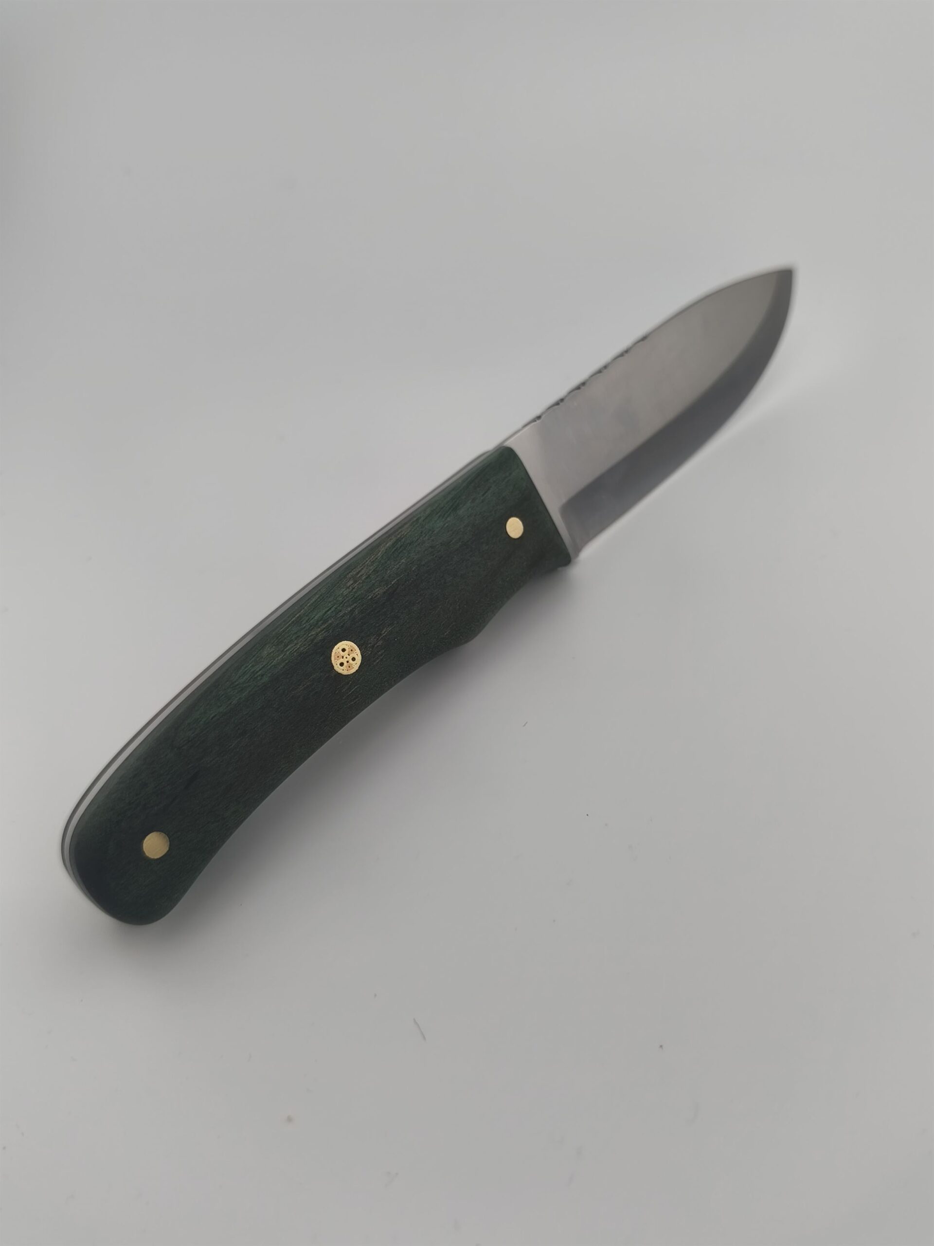 Le manche est en noyer stabiliser dans du jus de cactus avec une teinte vert émeraude, 2 rivets laiton de 4mm et un rivet mosaïques de 6mm au centre.