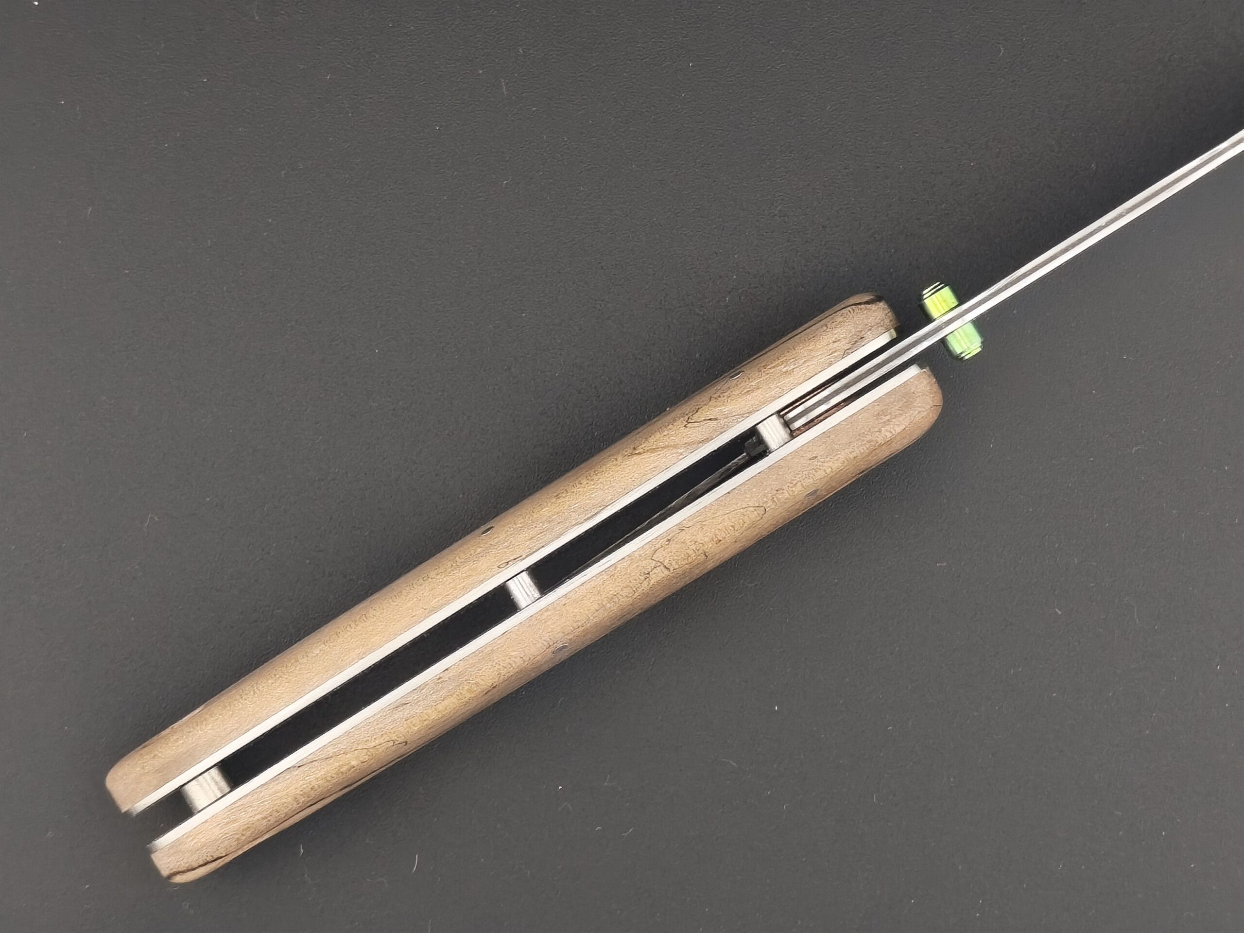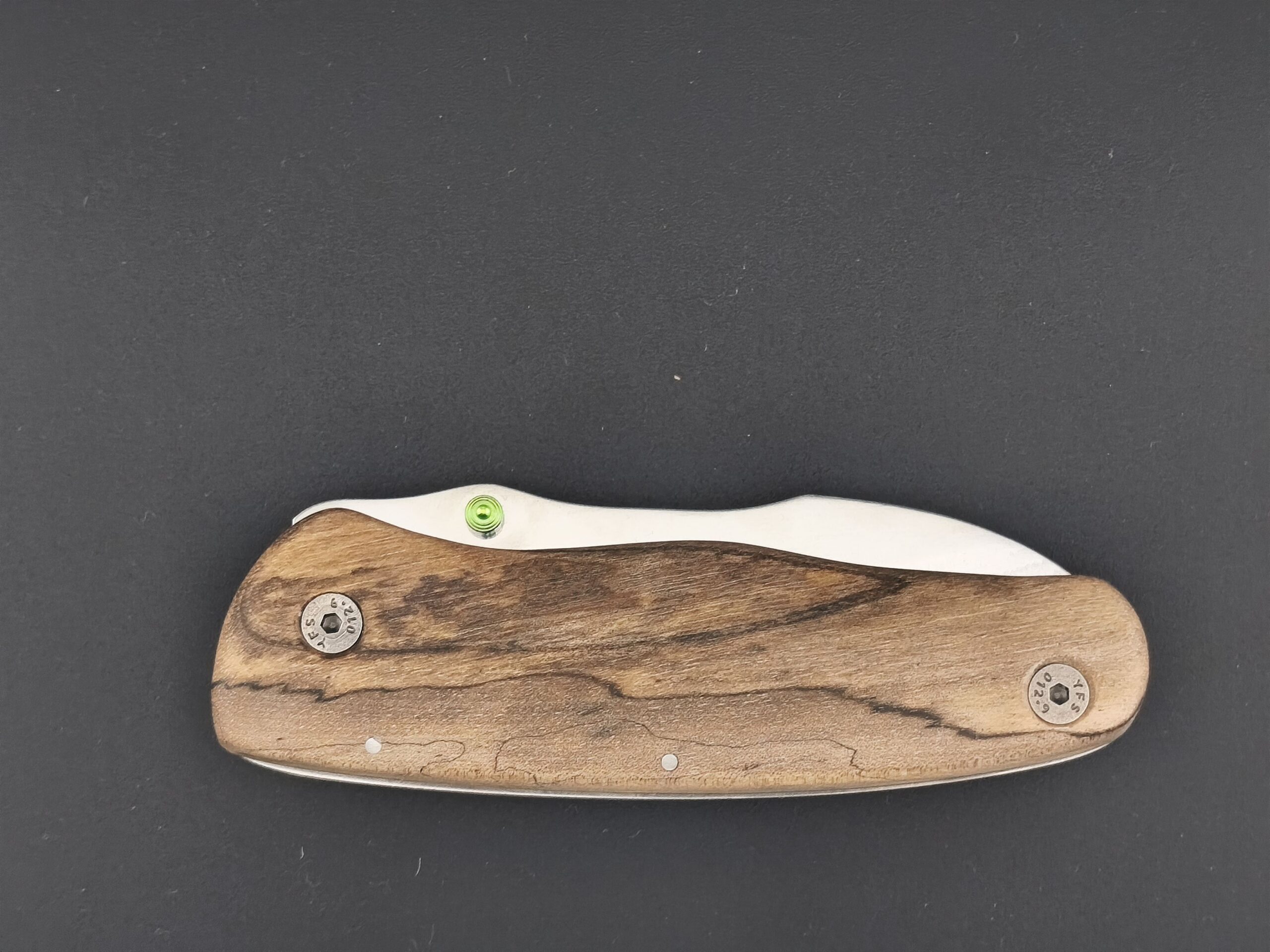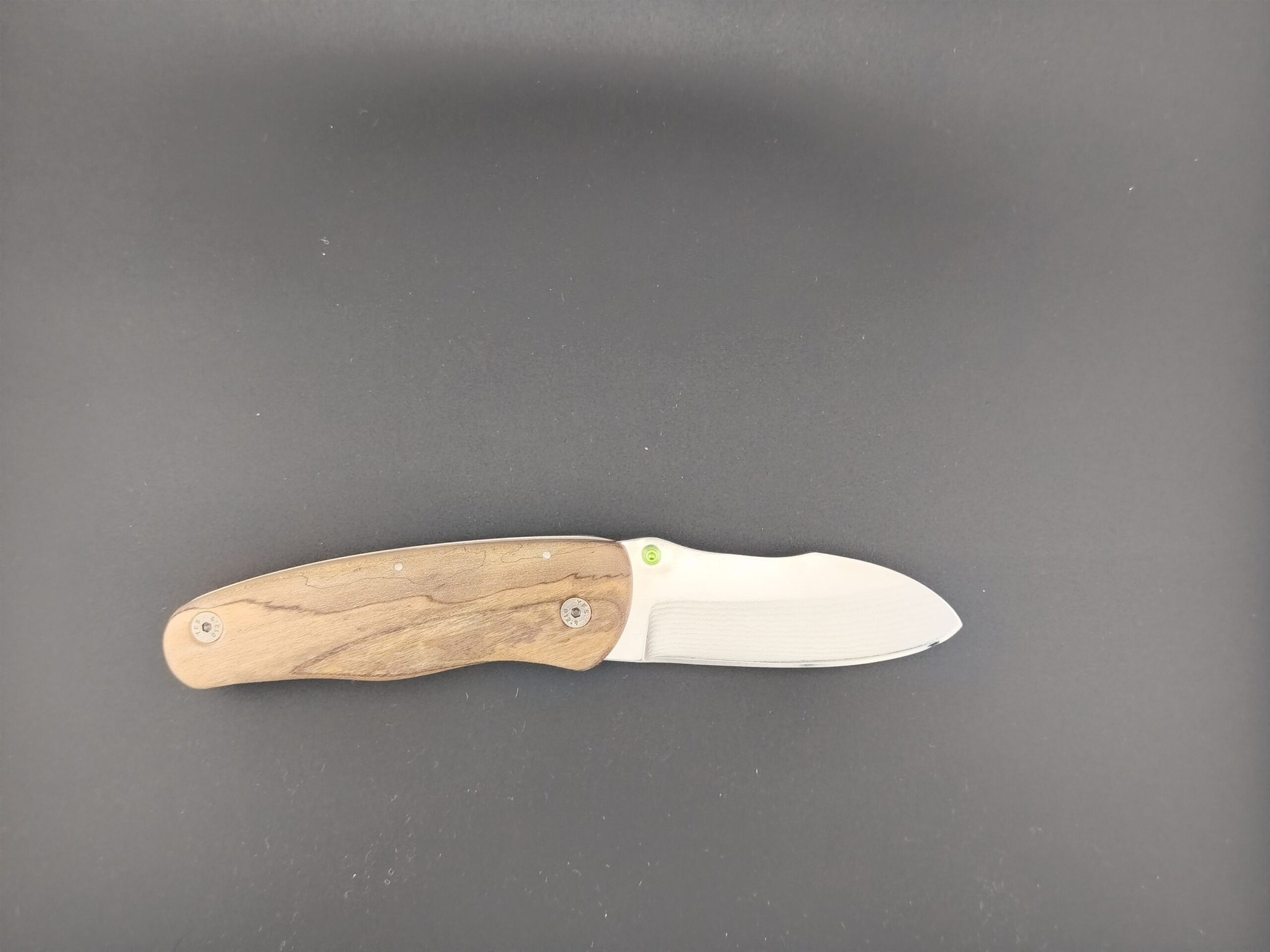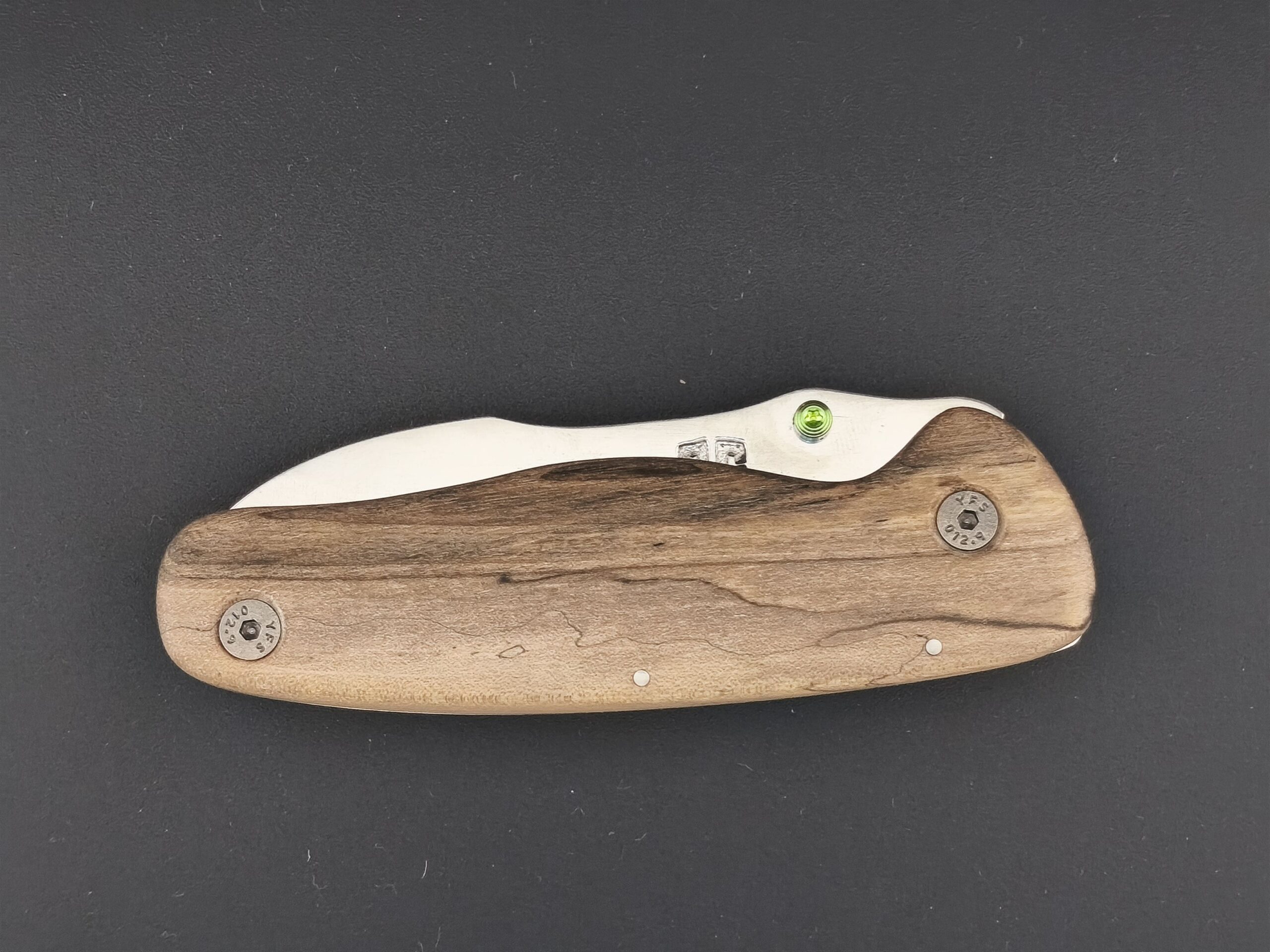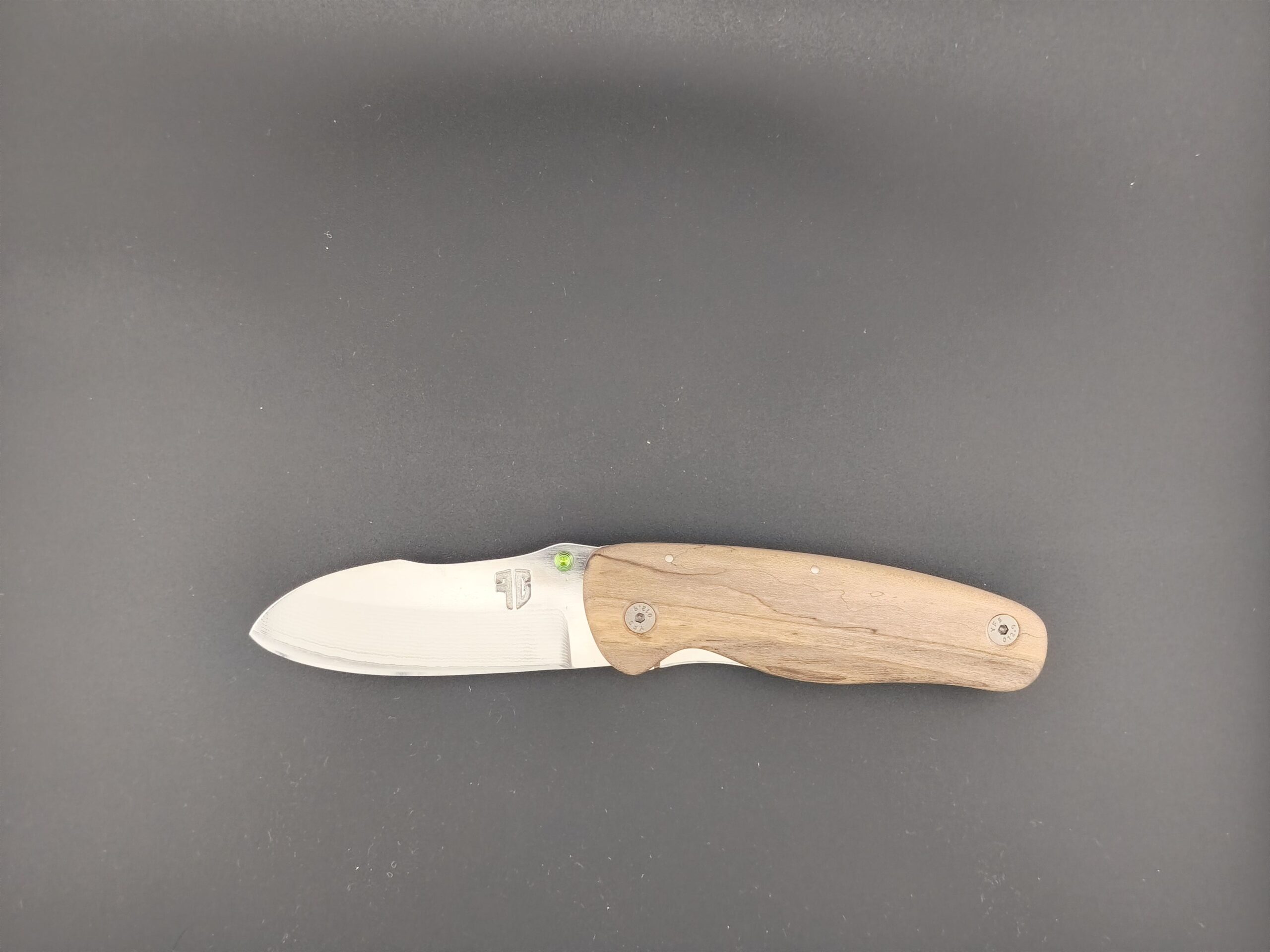La platine est habillé avec 2 plaquettes en noyer stabilisé par mes soins, en teinte neutre, une butée de pouce « verte iridescente » pour faciliter l’ouverture est présente.