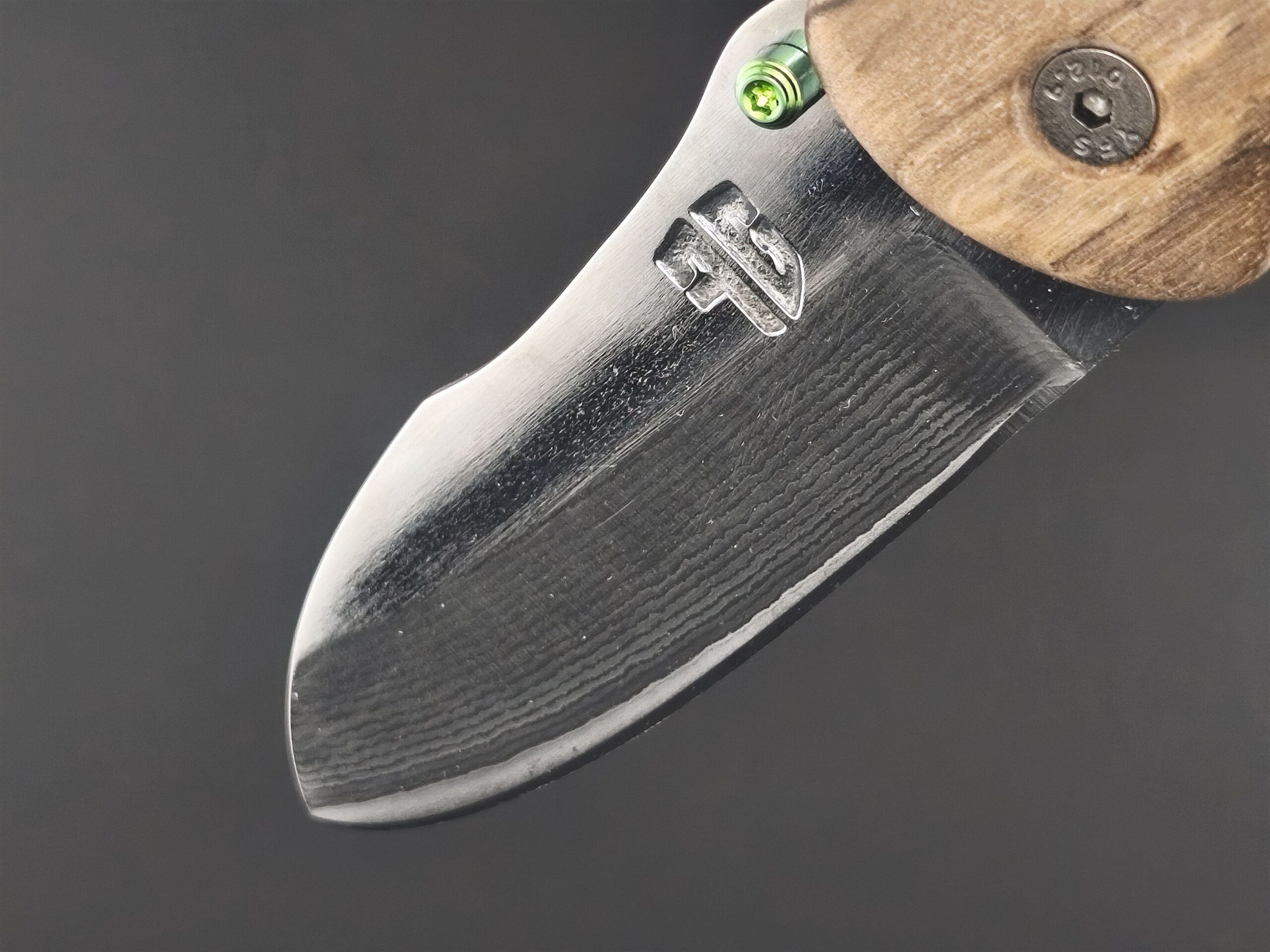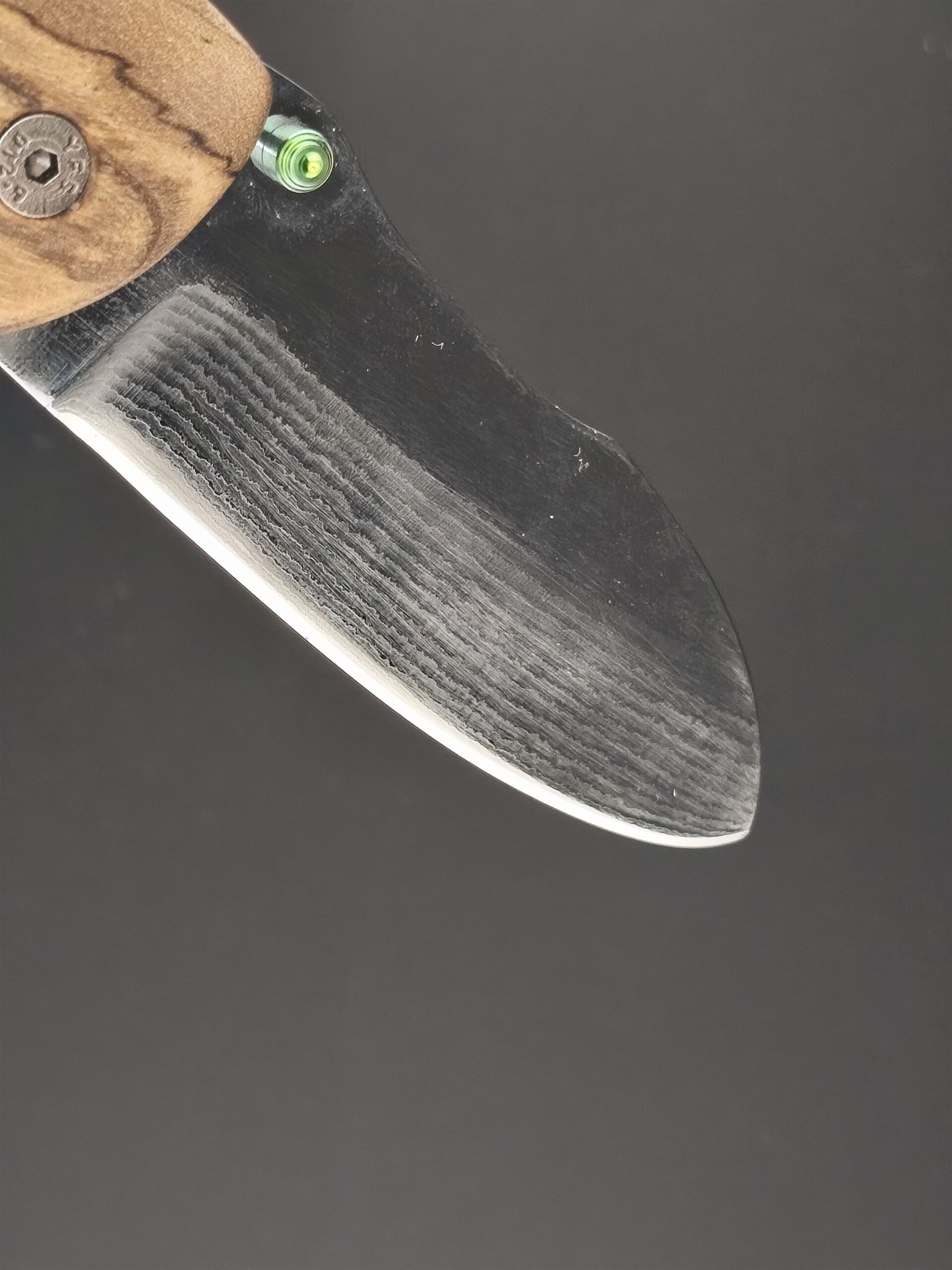 Couteau pliant en acier sandwich Japonais Suminagashi VG10 qui est constitué d’une âme centrale en VG10 recouverte sur chaque côté par 33 couches d’acier inoxydable non trempant.